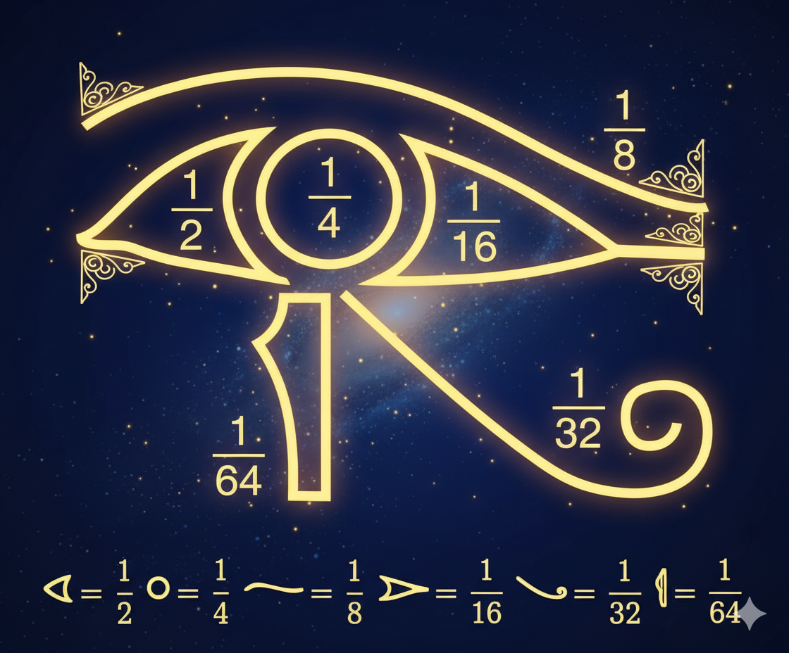 Según el mito, el ojo de Horus fue despedazado por Set y luego restaurado por Thot. Sin embargo, la restauración no fue perfecta. Matemáticamente, el ojo se divide en seis partes, cada una representando una fracción de potencia de dos: